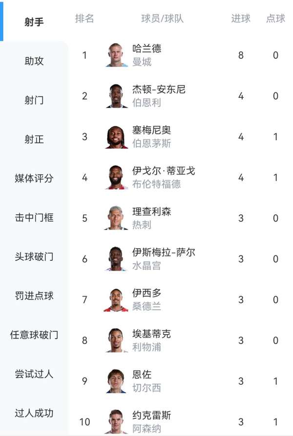 目前共有三名球员以4球并列次席,分别是纽卡斯尔联的杰顿-安东尼、布伦特福德的塞梅尼奥以及新晋射手伊戈尔·蒂亚戈。而埃基蒂克、约克雷斯和恩佐·费尔南德斯等六名球员则同以3球位列第三梯队,形成了颇具规模的追赶集团。