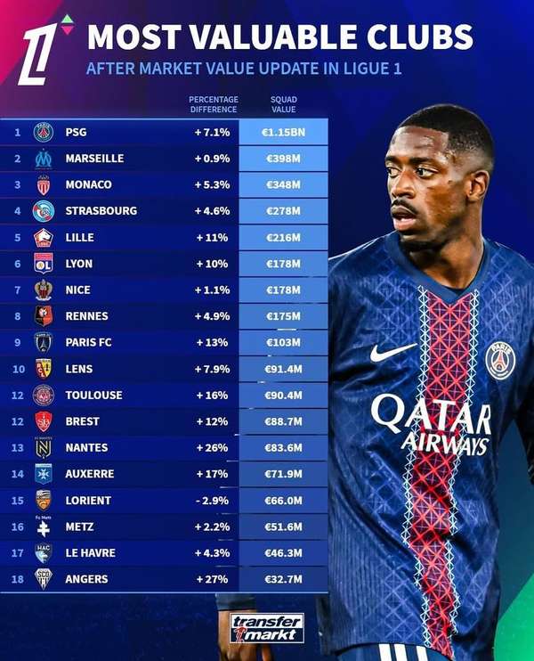 从整体榜单来看,巴黎的身价几乎是第二名马赛的三倍,形成断崖式领先。斯特拉斯堡(2.78亿欧元)和里尔(2.16亿欧元)分列第四、五位,其中里尔身价涨幅达11%,成为榜单中增长较快的俱乐部之一。