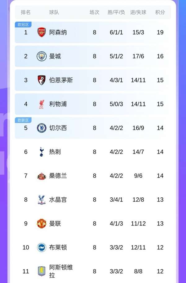 英超第八轮战罢,积分榜呈现罕见胶着态势。阿森纳凭借本轮胜利以3分优势领跑积分榜,而排名第二的曼城至第九的曼联之间仅相差3分,一场比赛的胜负便可能彻底改变争冠格局。
