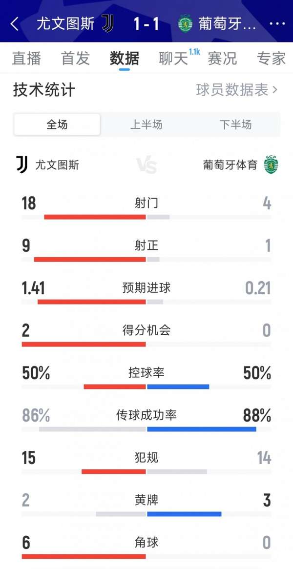 控球率呈现五五开局面(50%-50%),但传球成功率方面葡萄牙体育以88%略胜一筹(尤文86%)。双方对抗激烈,合计出现29次犯规,客队领到3张黄牌稍多于主队的2张。角球数据则呈现一边倒态势,尤文获得6个角球机会,对手则为零。