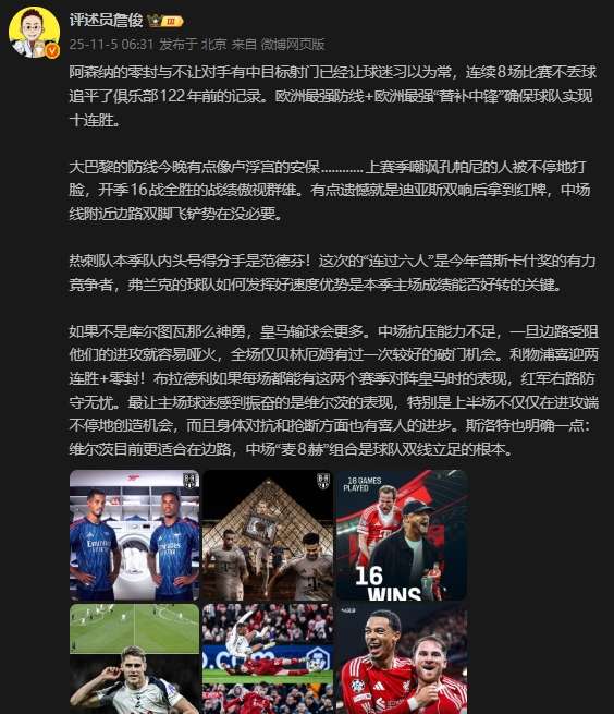 枪手阿森纳延续出色防守表现,连续八场零封对手追平俱乐部122年历史纪录。詹俊认为,欧洲顶级的防线配置与高效的替补中锋,共同铸就了球队各项赛事十连胜的佳绩。